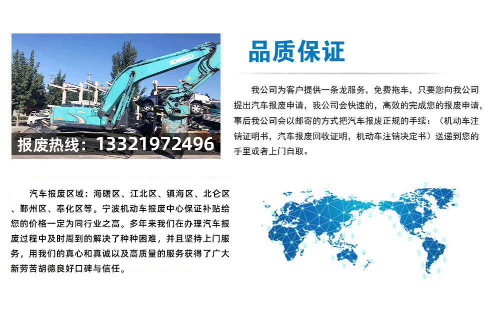 我公司在汽车报废领域有十几年的从业经验,主要面向社会车辆进行汽车报废咨询和手续一站式办理的单位,本公司主要办理:宁波汽车报废、货车报废、事故车报废、特种车辆报废等,为了给广大车主提供更好的服务质量,立足于社会,我们不仅开展免费拖车服务,还为广大车主提供免费办理报废汽车手续,免费申请报废指标的服务。 我公司经营多年,素质高、责任心强、专业、为广大车...